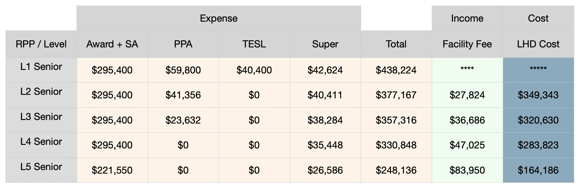 The Income at each increment of RPP Level has a larger component reliant on Private Patient billings. Higher volume Private Patient billings also result in more revenue in facility fees. In practical terms this means that from the perspective of the PHO / LHD the salary related expenditure is inversely proportional to Level election (i.e. the higher the RPP Level election, the less a Specialist employment costs the PHO / LHD).