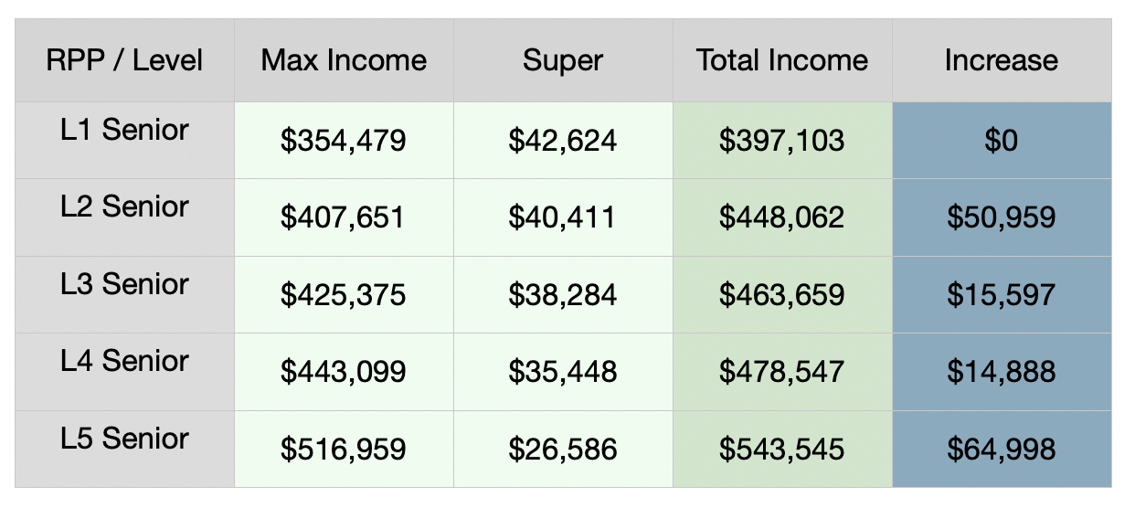 For RPP Levels 2 to 4 the Award Rate for a given Seniority is 100% of the corresponding rate on Level 1. (e.g. Level 4 Year 1 = 100% Level 1 Year 1)