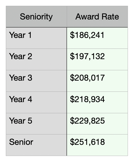 The Award Rate increments in accordance with Seniority – i.e. the years employed as a Specialist.