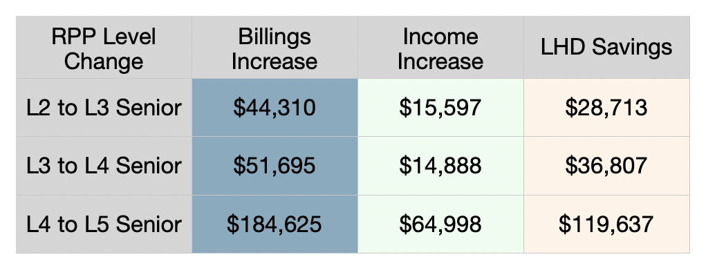 When going up a level in RPP election, any given increase in income also coincides with a significant reduction in the salary related expense to the PHO / LHD which means that the actual increase in Private Billings required to sustain the higher RPP Level are several fold the actual Income increase.